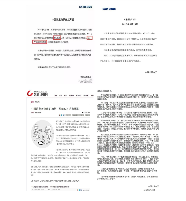 2016年9月1日,在被“央视财经”报道存爆炸风险后,三星Note 7依旧在中国开售,官方为此还特发声明,称中国消费者可“放心购买”。9月18日三星Note 7发生中国首炸,19日发生第二炸,同日三星发表回收首炸手机后的声明,也在韩国国内作出报道,指出:手机爆炸是因为中国用户故意加热,这是一种为了获得赔偿金的炒作行为。但令其打脸的是,9月24日发生了第三炸,26日第四炸、第五炸,28日第六炸,直到29日三星仍坚持声明“手机电池内部并无燃损迹象,爆炸为外部热冲造成”,但爆炸事件也并未停止。因舆论持续发酵,10月11日三星终于做出保证,承诺将“停售并召回所有国行Note 7”,并高举“做中国人民喜爱的企业,贡献于中国社会的企业”大旗,将之前污蔑中国用户的内容全部删除且避而不谈。
