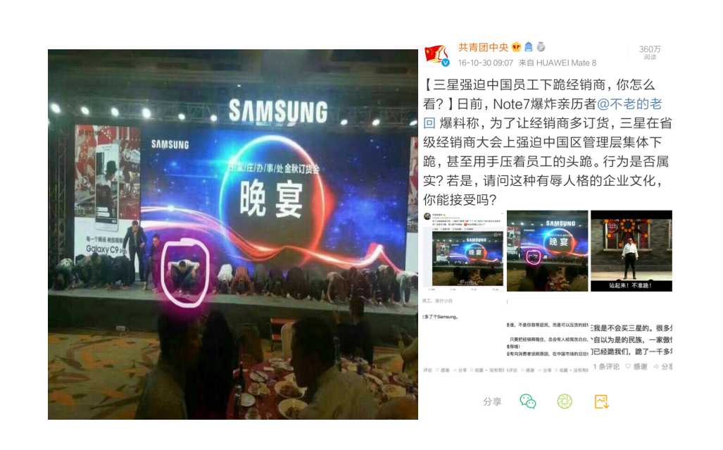 在Note 7手机事件不久之后,同年10月的月底,三星再一次被推上了风口浪尖。据网友“不老的老回”爆料称,三星在石家庄举办的省级经销商大会上,强迫中国管理层集体下跪,甚至用手压着员工的头跪,该事件在中国引起轩然大波,还受到了“共青团中央”官博的重视,将其评论为“有辱人格的企业文化”。随后,三星在接受澎湃新闻等媒体采访时,为这件事情辩解称,Note 7事件后经销商们依然下了很多订单,韩国高管被这种患难见真情的行为感动了,下跪表示感谢,中国高官下跪则是为了回礼。