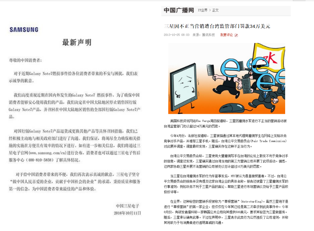 在整件中,三星首先是召回除中国之外,全球其他所有地区的Note 7手机。然后,在爆炸持续发生后,将主要矛盾转移在中国用户身上,污蔑他们是因为想得到赔偿金所以故意加热手机。最终,决定召回所有国行Note 7手机时,其实等于间接承认了其手机存在的问题,但声明中并没有对手机问题进行任何描述,道歉也含糊其辞,甚至直接故意忽视之前冤枉过的中国用户。是谁给了三星如此大的底气,连一个道歉都不想付出一点真诚呢?或许是水军。