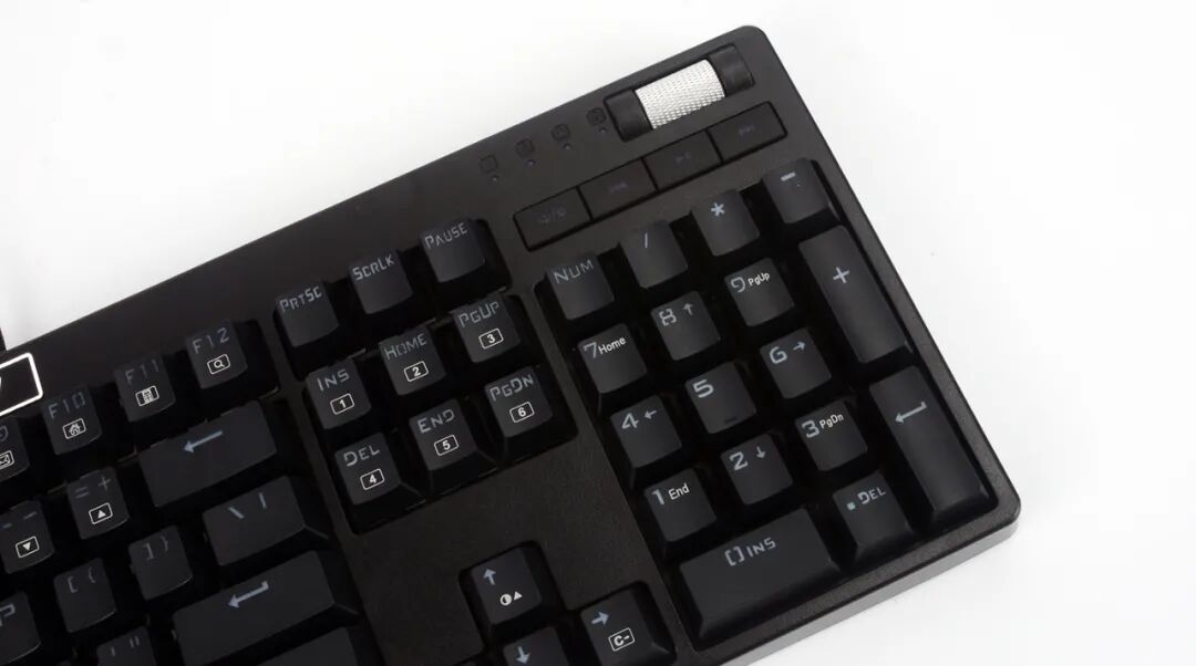 小键盘上方有音量滚轮和多媒体控制键,这在一般入门级别的机械键盘上比较少见。