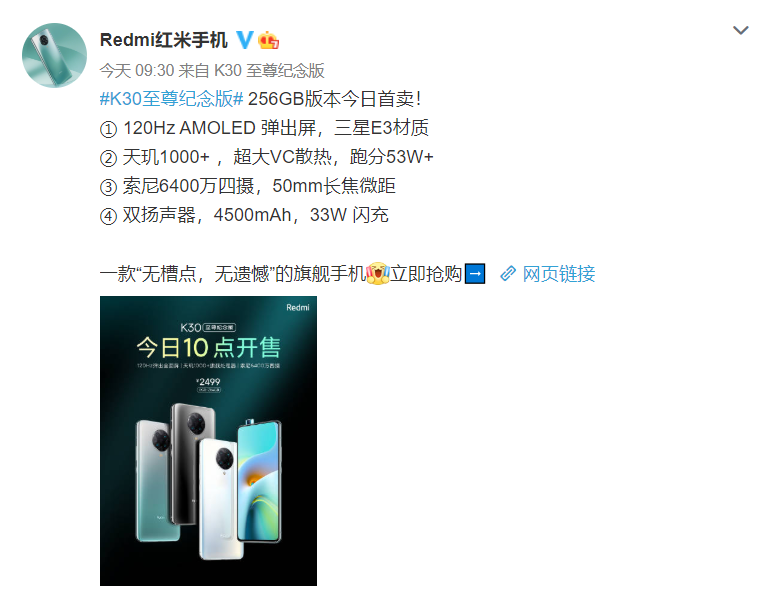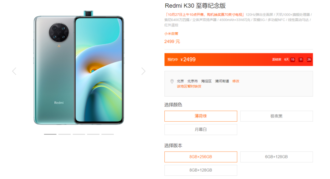Redmi K30至尊纪念版 8+256GB版本定价2499元。遗憾的是,截止发稿之前,官网已显示无货。没有买到的朋友可以关注一下Redmi手机官方微博,了解最新的发售消息。